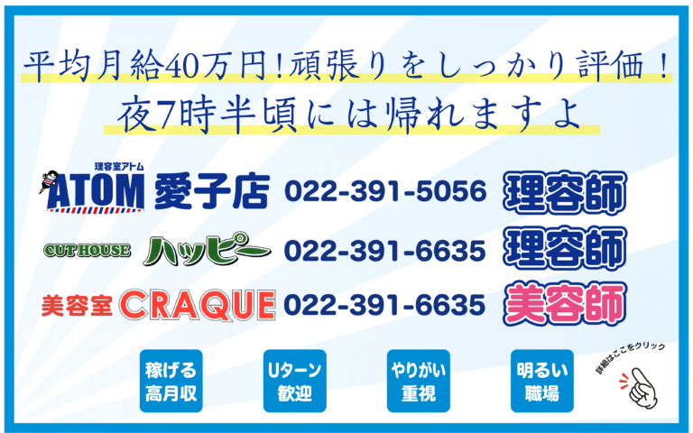 美容室CRAQUE(クラッキ)は子育てやお仕事でお忙しい方々が、少しの時間でも「癒し」の時間を持っていただけるよう、リーズナブルで無駄のないサービスを提供しております。通常のサロンなどではヘアカットだけでも1時間以上予定を開けなければなりませんよね?なかなかその時間を作れない方もやっぱりたまにはリフレッシュされたいはずです。CRAQUEでは通常の約半分の時間、そして約半分の料金で美容室のサービスを堪能いただけます。もちろん短い時間だからと言って仕事が雑になるわけではありません。一人のお客様に一人の担当がつきますので、最初から最後まで無駄な待ち時間がないのです。サロンでありがちな「ちょっとお待ちくださいね」の10分・・・いやですよね。